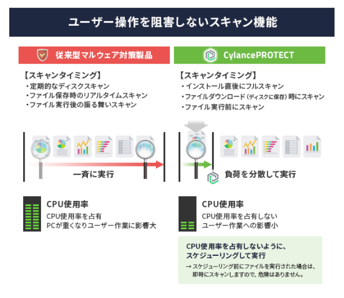 一方で、CylancePROTECTはパターンファイルに頼らない検知方式のため、常に安全にPCをご利用いただけます。また、オフライン環境や出張先でも安全に使うことができます。