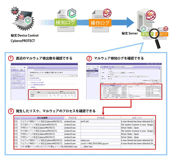CylancePROTECTのマルウェア検知ログを秘文Serverで収集し、秘文のユーザー操作ログと組み合わせて可視化することで、ランサムウェアなどのマルウェアの侵入契機となったユーザー操作を特定、再発防止策の迅速な立案を支援します。