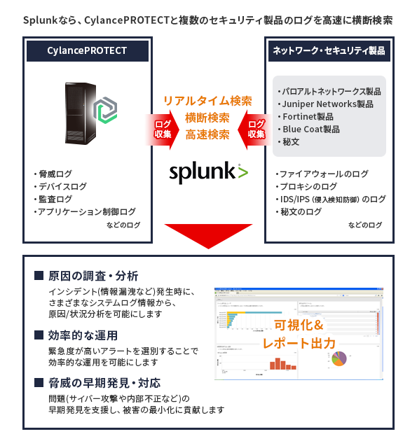 インシデント発生時にCylancePROTECTのログやネットワーク製品などのログを収集し、取り込んだ複数のデータに相関付けを行い、横断的に検索することができます。