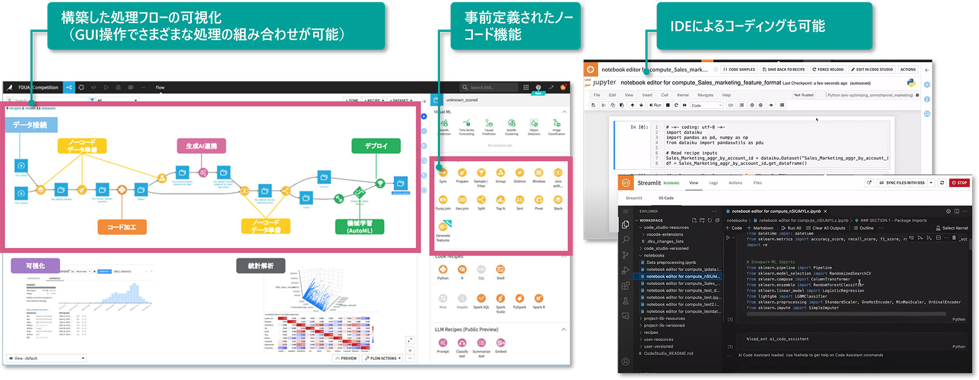 - データクレンジングや特徴量作成などがノーコード・ローコードで実装可能
