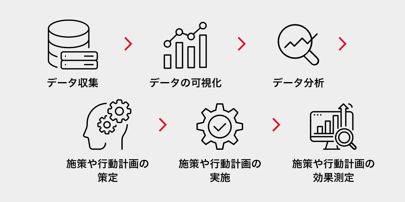 では、実際にデータドリブンマーケティングを実行するにはどういった要素を揃え、どういった手順で進めればいいのでしょうか。大枠でいうと、「データ収集」→「データの可視化(加工)」→「データの分析」→「施策や行動計画の策定」→「施策や行動計画の実施」→「効果測定」 という流れで進め、PDCAを回していきます。