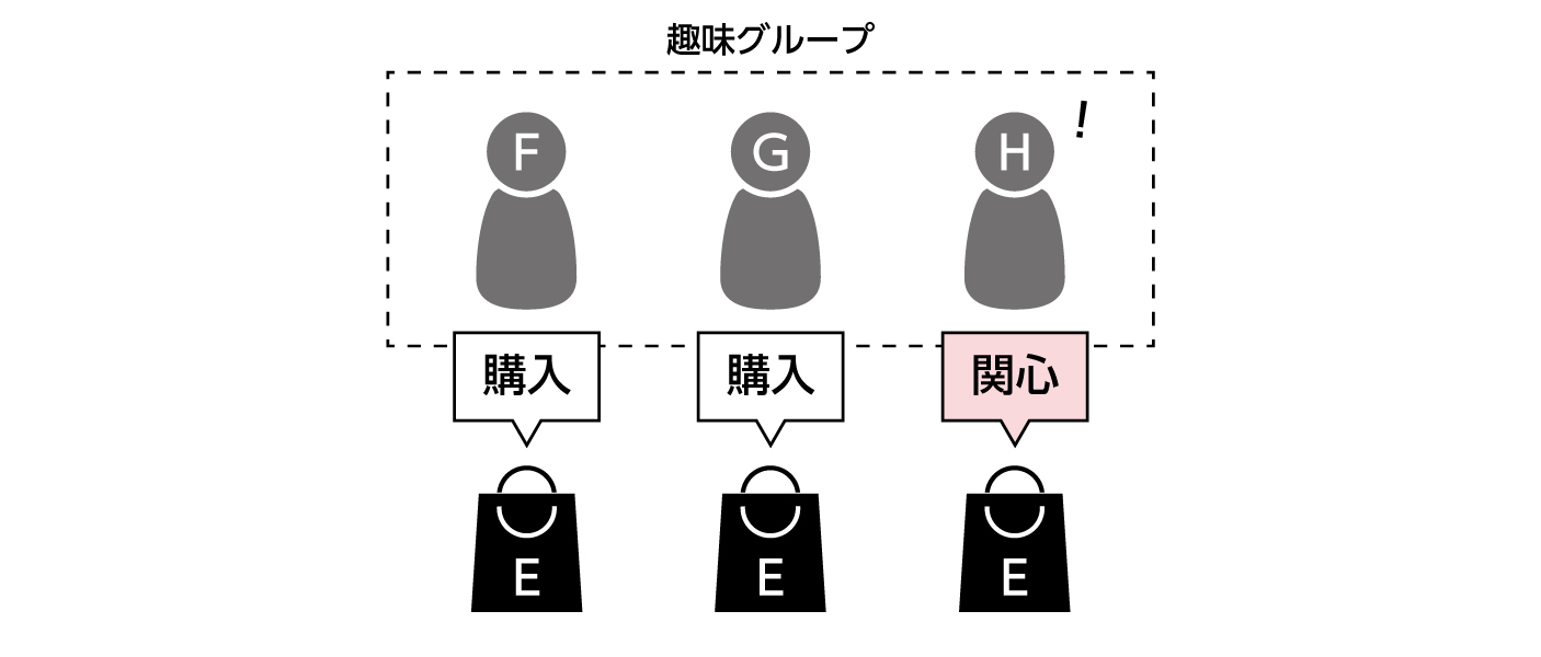 また、商品Eを購入した顧客F、GとSNSの趣味グループでつながりのある友人Hは、同じ商品Eに興味を持つ可能性があると考えて、新規顧客開拓につなげることもできるでしょう。