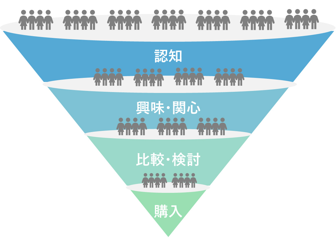 マーケティングファネルとは、顧客のサービス認知から購入に至るまでの過程を図式化したもので、段階を踏むごとに人数が絞られていく様子を表しています。