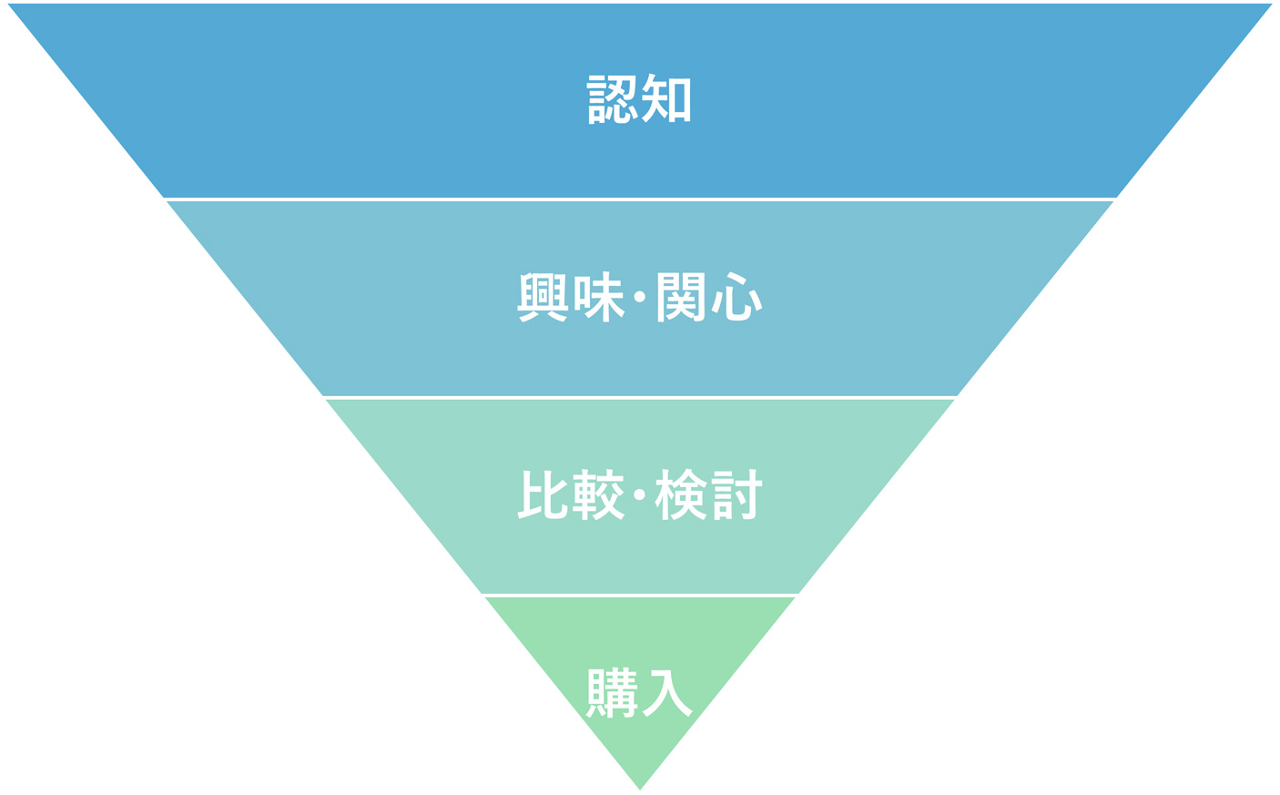 顧客の購買行動は、認知、興味・関心、比較・検討、そして最終的な購入(CV)に至るまでに人数が徐々に減少していくため、パーチェスファネルは逆三角形で示されます。