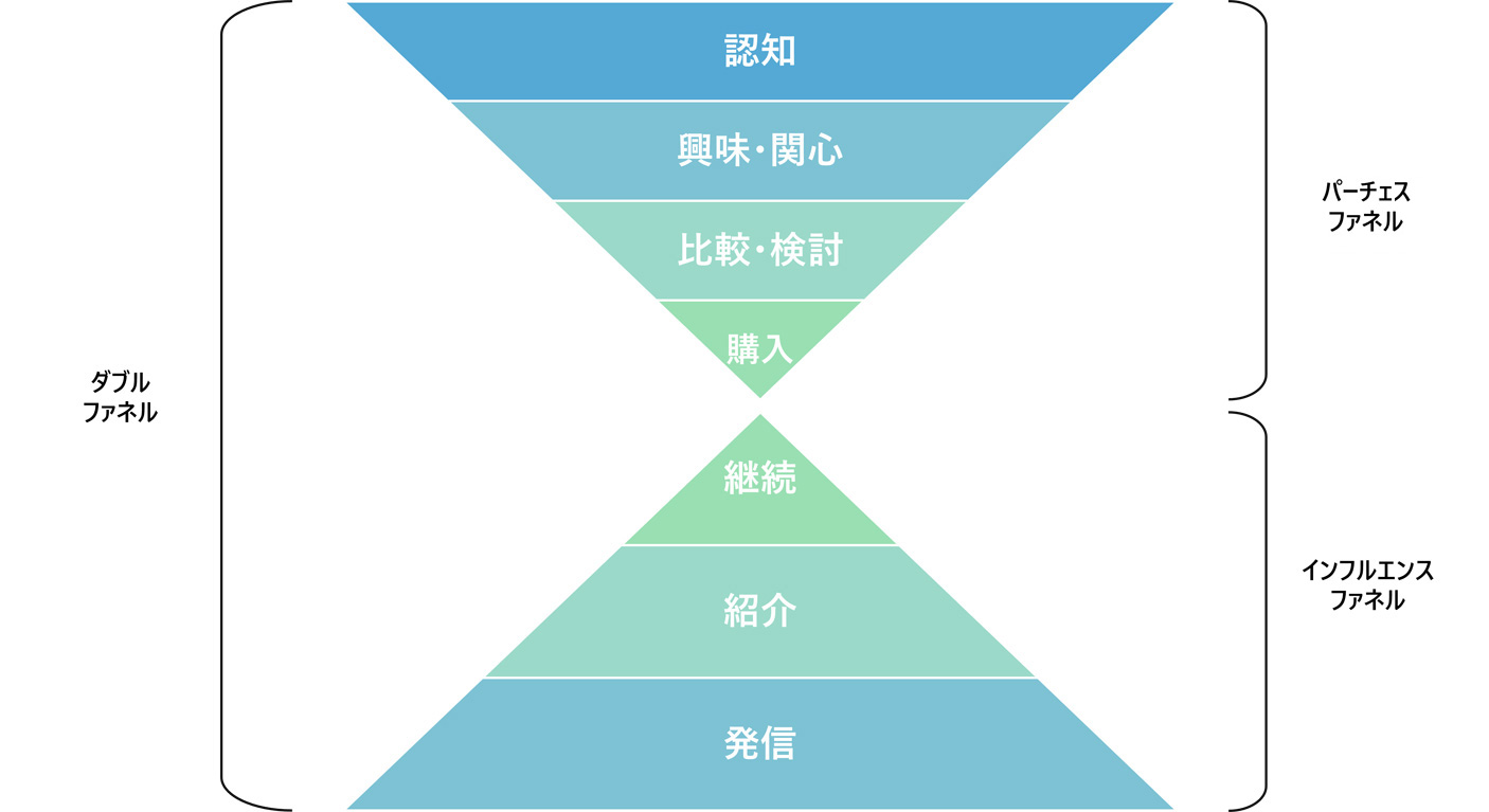 ダブルファネルを用いれば、顧客が商品を認知して購入し、他者にその商品を広めるまでの一連の行動を詳細に把握できます。