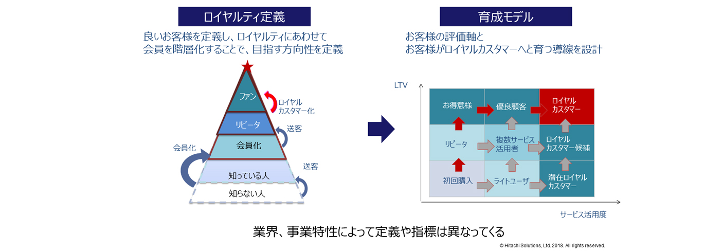 その後、LTV(Life Time Value;顧客生涯価値)とサービス活用度を掛け合わせた、お客さまの評価軸による、お客さまがロイヤルカスタマーへと育つ銅線を設計する育成モデルを構築します。ただし、業界や事業特性の違いによって定義や指標は異なるため、世の中の動向や競合の状況を見ながらデータを分析し、正しくファンを育成していくことが必要になります。