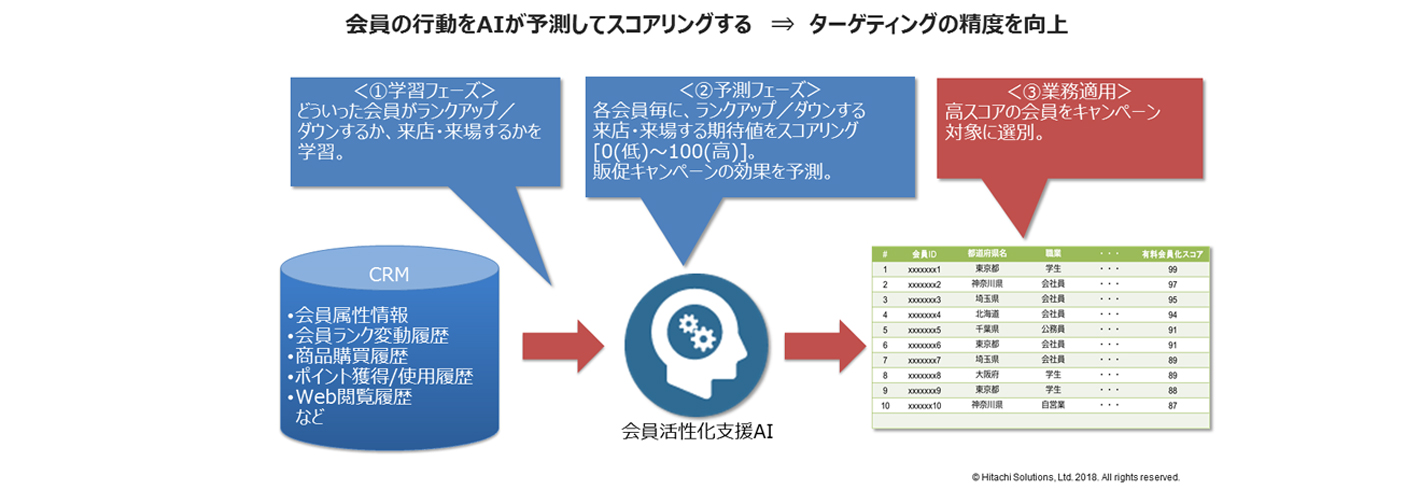 日立ソリューションズのディープラーニングを活用した「会員活性化支援AIソリューション」は、会員の行動をAIが予測してスコアリングしてターゲティングの精度を向上するソリューションとして開発されました。