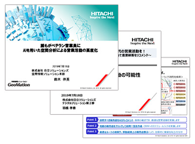 鈴木は、GeoMationと連携する日立ソリューションズのAI技術について説明した。「当社のAIは、SFA/CRMや基幹システムなどの企業保有情報だけではなく、無償・有償の地図や統計データによる地域的な特徴、例えば販売店周辺の地理的情報も数百種類入力して分析可能なため、より高精度な予測・レコメンドを実施できるようになります」
