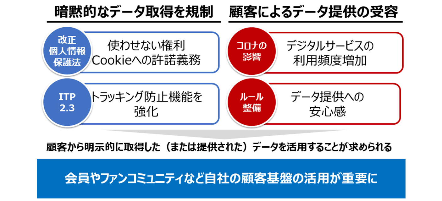 従来は、ID-POS、アンケート、市場調査など統計的なデータからターゲットを絞りアプローチしていたが、現在ではCookieなどのデジタルデータやSNSなどを活用してお客さま一人ひとりの行動データを活用したアプローチが主流になってします。そして、お客さま一人ひとりに向けたアプローチをするためには、お客さまの情報を収集・活用することが求められると語ります。その反面、Cookieに対する規制強化、ITP2.3などを例に挙げ「暗黙的なデータ取得や利用は規制される流れにある」と指摘します。