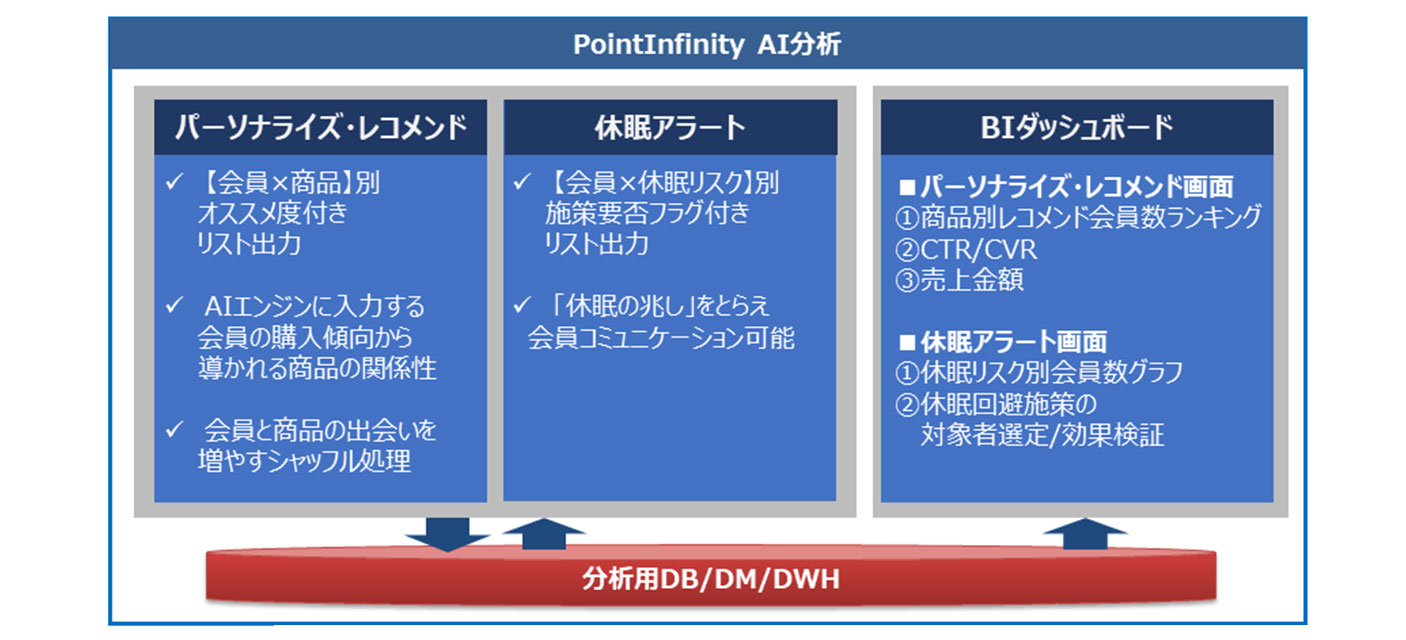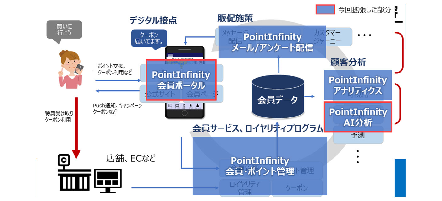 従来の『PointInfinity』は、会員・ポイント管理機能を中心としたCRMシステムだったが、ここに会員ポータル機能とAI分析機能を加え、デジタルマーケティングに必要な機能をワンストップで提供します。