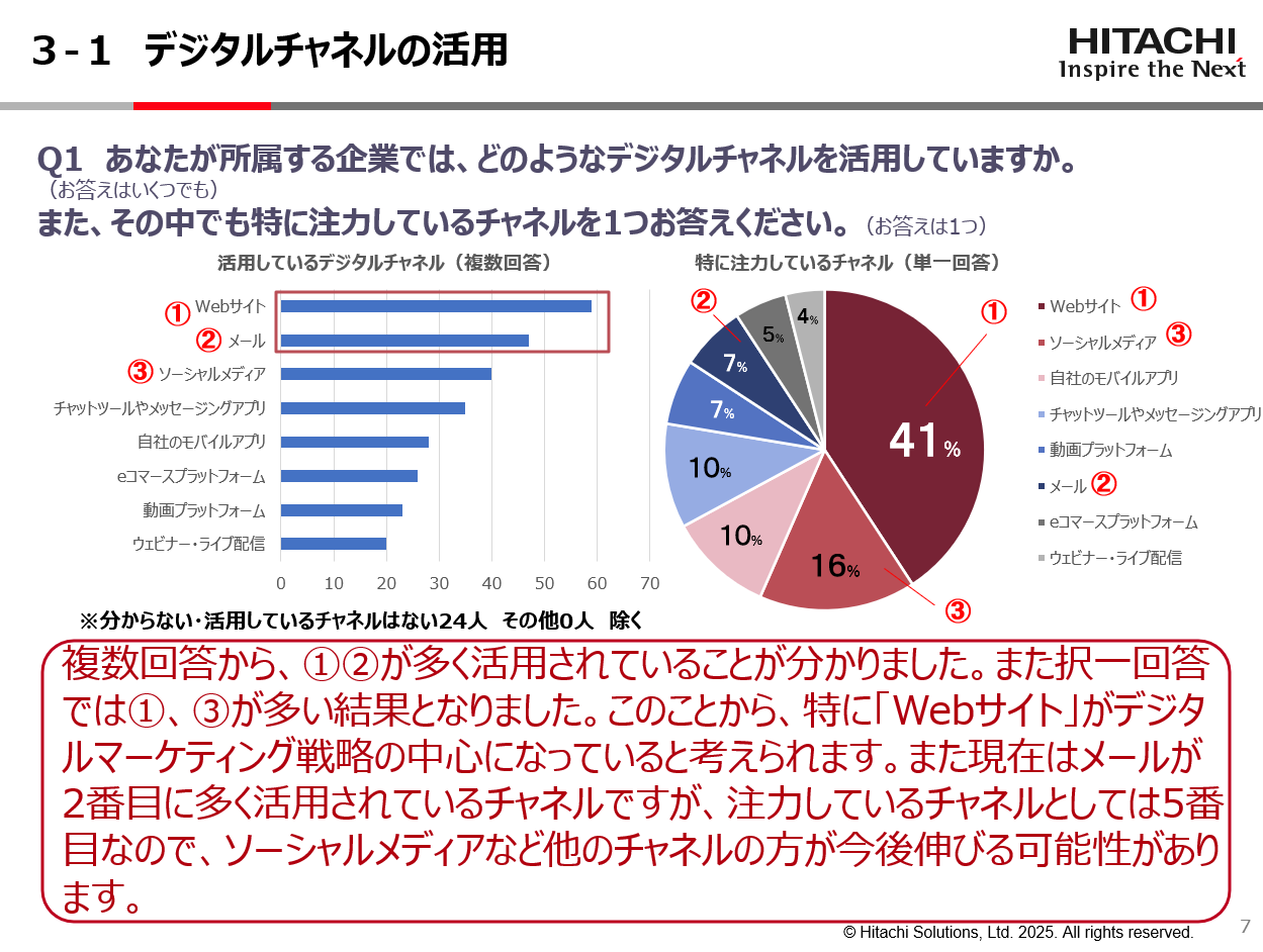 複数回答から、①②が多く活用されていることがわかりました。また択一回答では①、③が多い結果となりました。このことから、特に「Webサイト」がデジタルマーケティング戦略の中心になっていると考えられます。また現在はメールが2番目に多く活用されているチャネルですが、注力しているチャネルとしては5番目なので、ソーシャルメディアなどほかのチャネルの方が今後伸びる可能性があります。