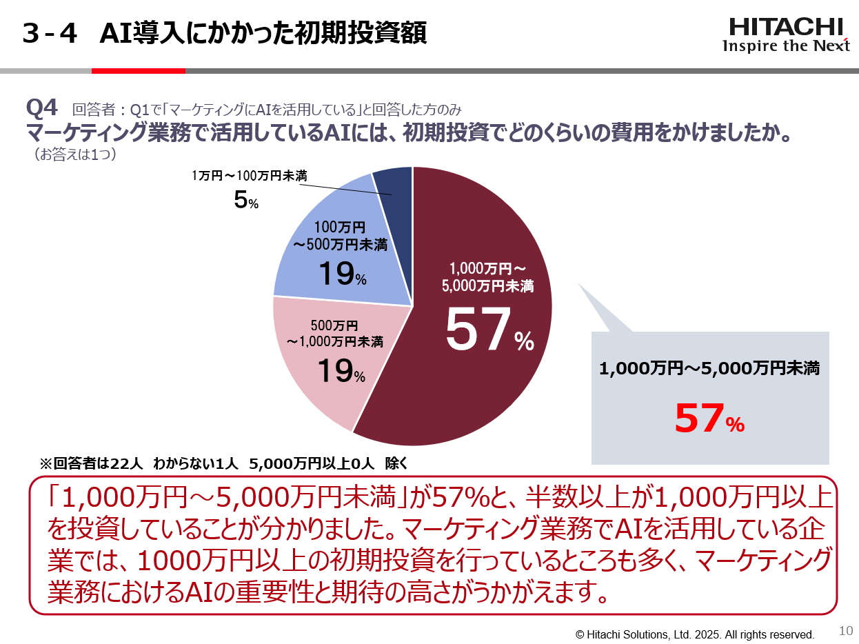 マーケティング業務で活用しているAIにかけた初期投資額は「1,000万円~5,000万円未満」が57%