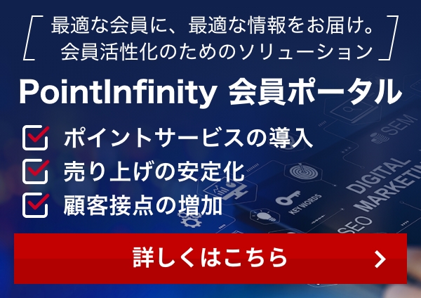 PointInfinity 会員ポータルCMSPointInfinity 会員ポータルはPointInfinity(会員・ポイント管理)やPointInfinity AI分析と連携し、最適な会員に、最適な情報を届け、会員活性化を図るためのマーケティングの場を提供するソリューションです。カテゴリー製品名概要CMSPointInfinity 会員ポータルは、会員・ポイントサービスに必要な手続き、情報を一元的に提供し会員サービスの利便性を向上させます。また、嗜好、購買行動などお客さまに合わせた情報発信により、お客さまの購買行動促進、ロイヤルティ向上を実現します。CMS