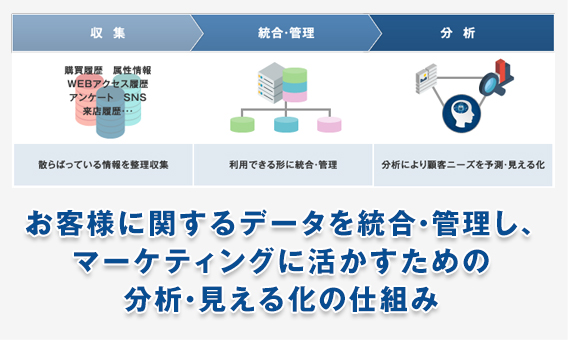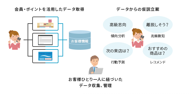 蓄積されたお客さまの情報から、お客さまの特性を見出し、仮説立案、行動予測を実施。