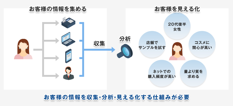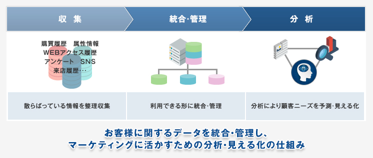 顧客分析は、データドリブンでのマーケティングを推進するために、データからの課題発見、施策検討/ターゲティングのための仮説立案および実施した施策の効果検証を支援する基盤です。