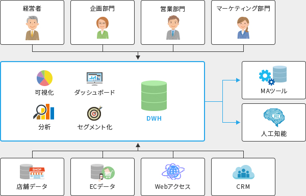 市場に多く流通する、BI/DWHツールの特徴を把握したコンシェルジュがツール選定、システム構築のアドバイス。"データ収集"・"データ集積"・"可視化"をトータルで実現する効果的なBIシステムの構築を支援。