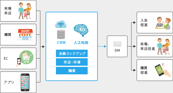 AI分析は、会員の購買行動やコンタクト履歴を統合・分析して会員個々の嗜好・ニーズを予測し、最適な商品レコメンド(会員と商品の出会い)を実現。会員との最適なコミュニケーションタイミングを会員個々に予測(休眠回避施策の対象者をリストアップ)。