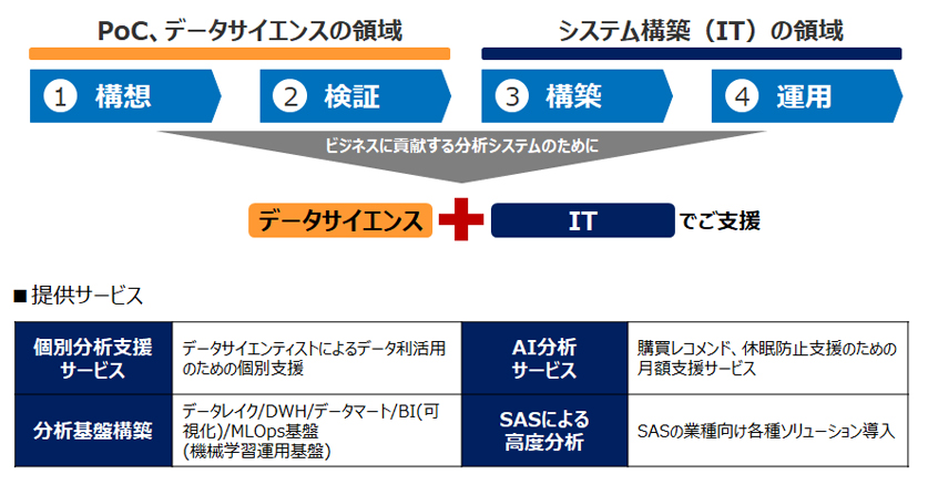 効果的な分析システムの導入・運用のため、構想から運用まで、データサイエンスとITのノウハウでお客さまをトータルにご支援します。データからビジネスの競争力、優位性向上に繋がる価値ある知見を見いだし、お客さまビジネスの発展に貢献します。