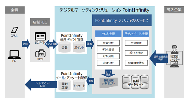 PointInfinity アナリティクスサービスは、ポイント運用状況の可視化やデータ分析を提供し、ポイントプログラムを利用したマーケティングを支援します。