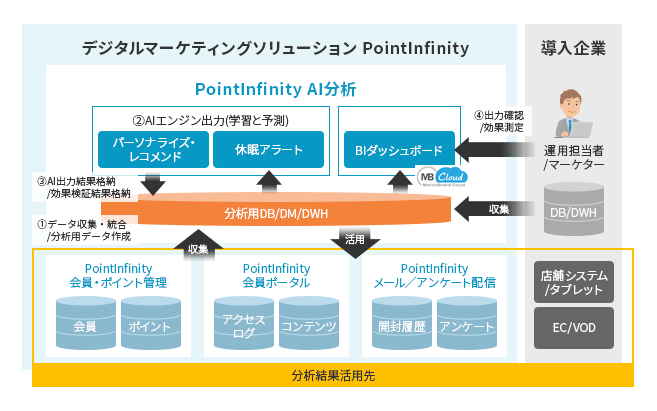 PointInfinity AI分析は、会員の購買行動やコンタクト履歴を統合・分析して会員個々の嗜好・ニーズを予測し、最適な商品レコメンド(会員と商品の出会い)を実現、さらに、会員との最適なコミュニケーションタイミングを会員個々に予測(休眠回避施策の対象者をリストアップ)する、攻めと守りのAIソリューションです。