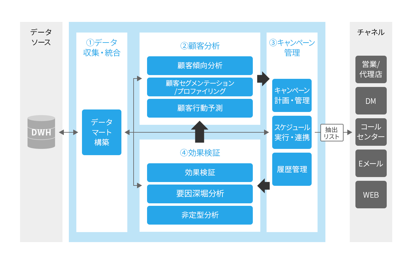 データ収集~統合~分析~マーケティングアクションとの連携~トラッキング&レポーティングまでエンドトゥエンドでカバーするソリューションです。