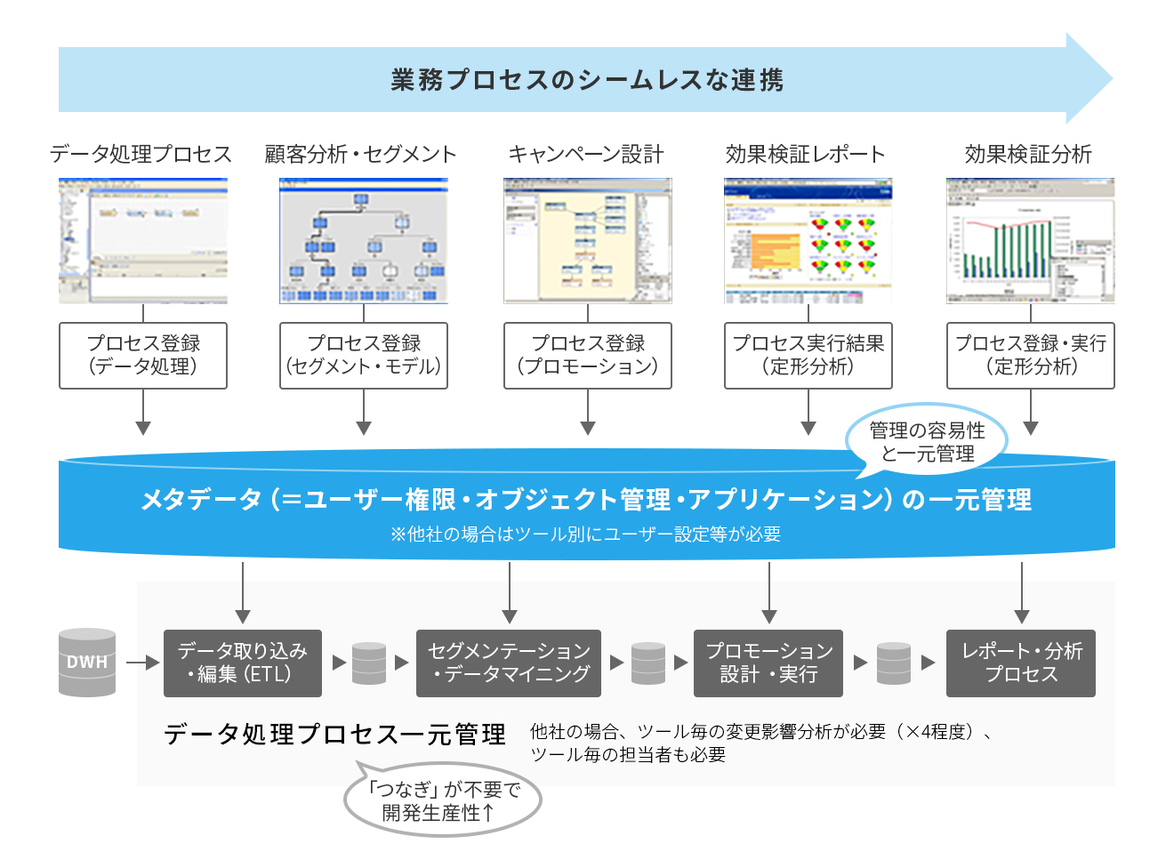 明細データ・顧客マスタなどの各種マスタ・コンタクト履歴などの各種データを収集・統合し、キャンペーン抽出や分析、効果検証など目的別のデータマートを作成します。GUIで効率的にプロセスを作成し、インパクト分析により複雑なプロセスの変更・メンテナンスに関わる作業を効率的に実現頂けます。