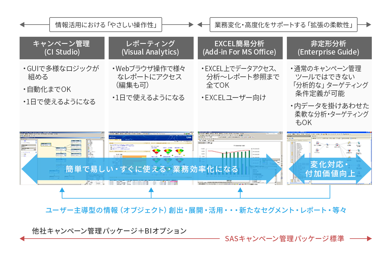 SAS Marketing Automationでは、他社ツール同様の「やさしい操作性」に加え、変化・高度化をサポートする「拡張の柔軟性」を備えた、“痒いところに手が届く“パッケージ構成となっています。