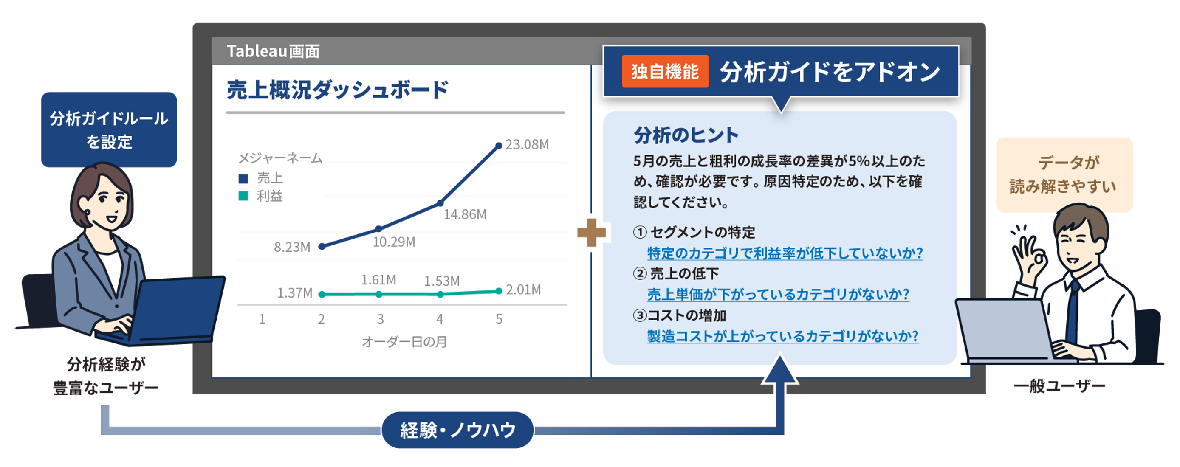 グラフだけではなく、分析観点のヒントを表示することで、 データ分析に慣れていない方でもデータを有効活用できるよう支援します。 また、組織で統一したい分析観点をガイド表示することで、分析観点の標準化も実現します。