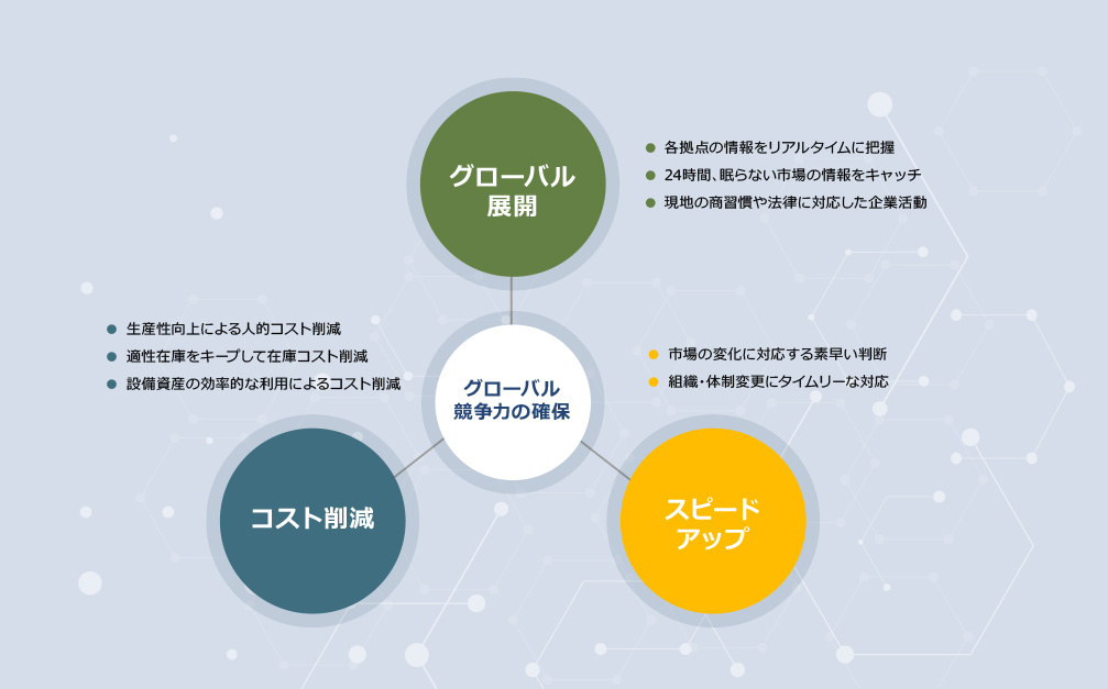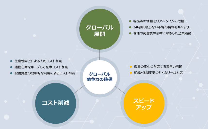 プロダクツ、物流、人材のグローバリゼーションが進む中、ITはこれらの仕組みを支えるインフラとして、ビジネス推進には欠かせないものとなっています。特に、企業の基幹システムとしての ERP、営業活動をサポートする CRM はその要であり、もはやひとつの国と地域で使えてさえいればよい、というものではありません。世界市場で持続的に成長を遂げるためには、状況をグローバルかつ一元的に見わたし、意思決定をサポートするシステムが必要なのです。