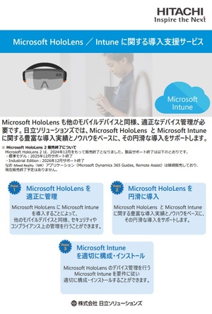 Microsoft HoloLens および Microsoft Intuneの導入に際しては、その特異性からOS、アプリケーションのセットアップにおいて通常のモバイルデバイスとは異なる独自のノウハウが必要となります。日立ソリューションズでは、Microsoft HoloLens と Microsoft Intune に関する豊富な導入実績とノウハウをベースに、その円滑な導入をサポートします。