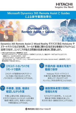 Dynamics 365 Remote Assist は、フィールド業務に従事するスタッフおよびマネージャーのための支援ツールです。Dynamics 365 Remote Assist と Mixed Reality デバイスである HoloLens やスマートデバイスなどを活用して、リアルタイムに情報を連携し作業することで、技術者らが問題をより迅速に解決できるよう支援します。