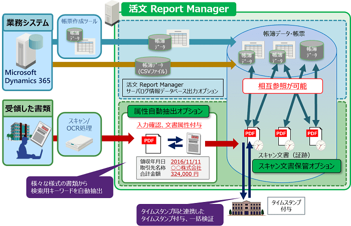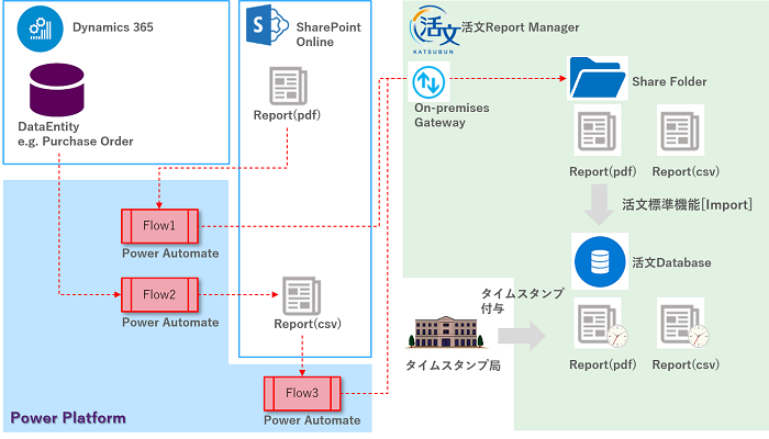 Microsoft Dynamics 365 に登録したデータや帳票は、Microsoft Power Platform をベースに電子帳票システム/活文 Report Manager に連携することができます。
