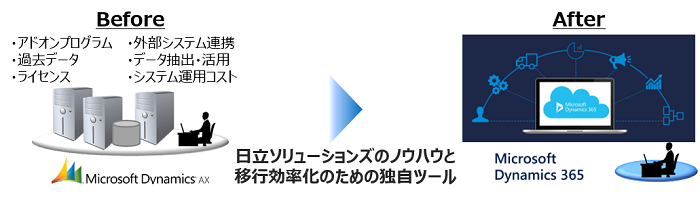 日立ソリューションズでは、Microsoft Dynamics 365 へのアップグレードにおける国内外の実績をベースとしたノウハウをサービス体系化*2し、提供します。本サービスにより、Microsoft Dynamics AX からの Microsoft Dynamics 365 への円滑なアップグレードを実現します。
