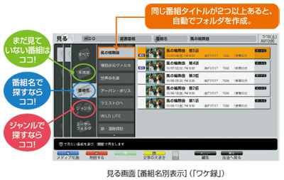 “ワケ録”とは、番組を録画するとそのタイトルやジャンルに応じたフォルダを自動的に作成し、分類できる機能。内蔵HDDに録画された多くの番組も、整理された状態で一覧表示されるので、見たい番組を簡単に探すことができる。この大量データの管理に、Entierが活用されているという。