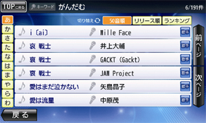 「キョクナビ(JR-300)」は、曲の検索効率を重視した画面設計を採用。「歌手名」「曲名」などの定番検索項目ばかりでなく「最近の番組/映画ソング」など新たな検索項目を追加し、曲がスピーディに見つかる工夫を凝らした製品だ。