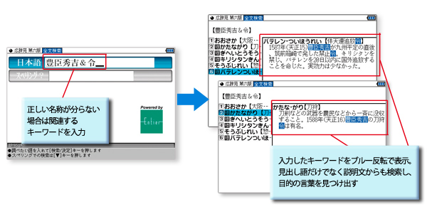 その中でも「全文検索機能」の搭載は、開発現場における長年の課題でした。全文検索機能を使うと、例えば「淀君」について知りたい場合、「淀君」と入力しただけで「豊臣秀頼」など「淀君」に関連する人物や、ゆかりの地を見出し語だけでなく、説明文からも検索することができます。また、例えば豊臣秀吉が行った法令を調べたい場合、正しい法令名称が思い出せなくても、「豊臣秀吉」&「令」などのように関連するキーワードを入力することで目的の言葉にたどり着くことができます。