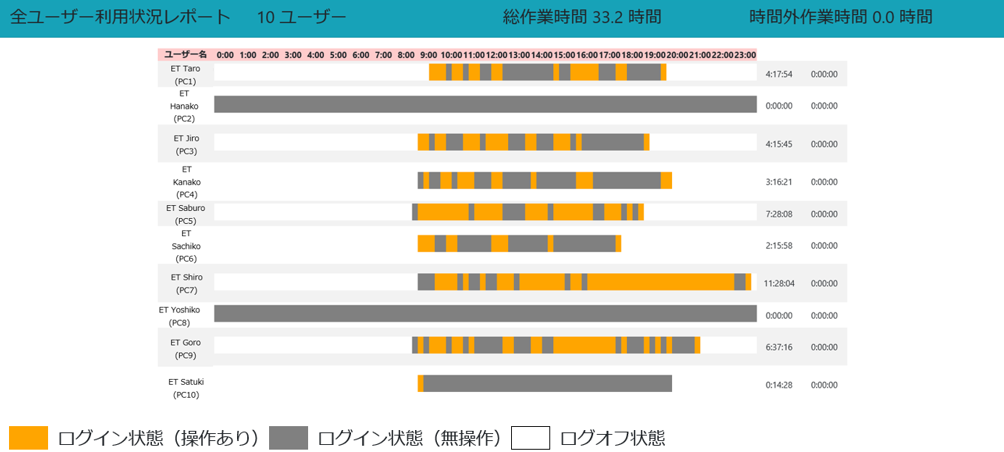 あらかじめ定義した内容に基づき、記録されたデータを集計・解析してモニタリングレポートを生成。プログラム別での作業時間や業務時間外のコンピューター利用状況などを分かりやすいグラフで確認できます。定期的な作業状況の把握や監査に活用可能です。
