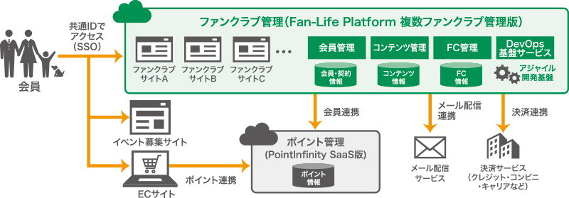- 共通IDを会員に与えることにより、複数のファンクラブを1つのクラウドサービスで統合的に管理