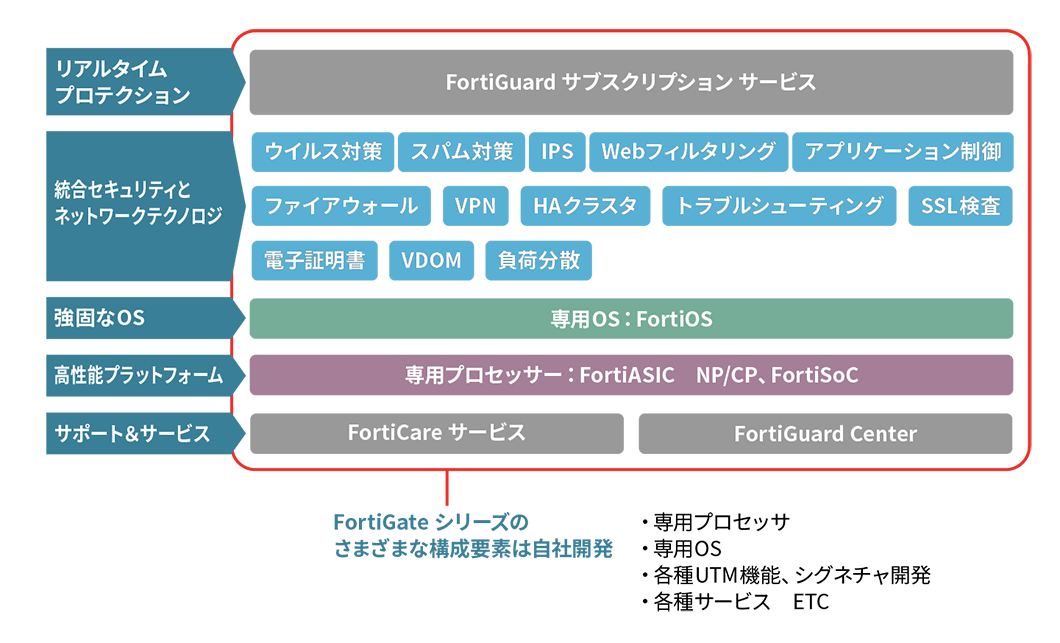 Fortinet社では、製品における構成要素、専用プロセッサーやOS、各種UTM機能、シグネチャなどを一貫して自社開発しています。