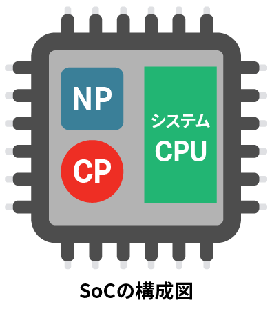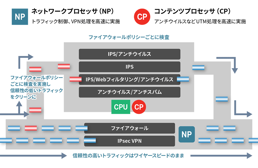 FortiASICは2種類あります。ファイアウォールのポリシー制御、VPNなどの処理を行う「ネットワークプロセッサー(NP)」と、UTM機能の処理を行う「コンテンツプロセッサー(CP)」です。 トラフィックを各専用プロセッサーで処理することで高速処理を実現しています。