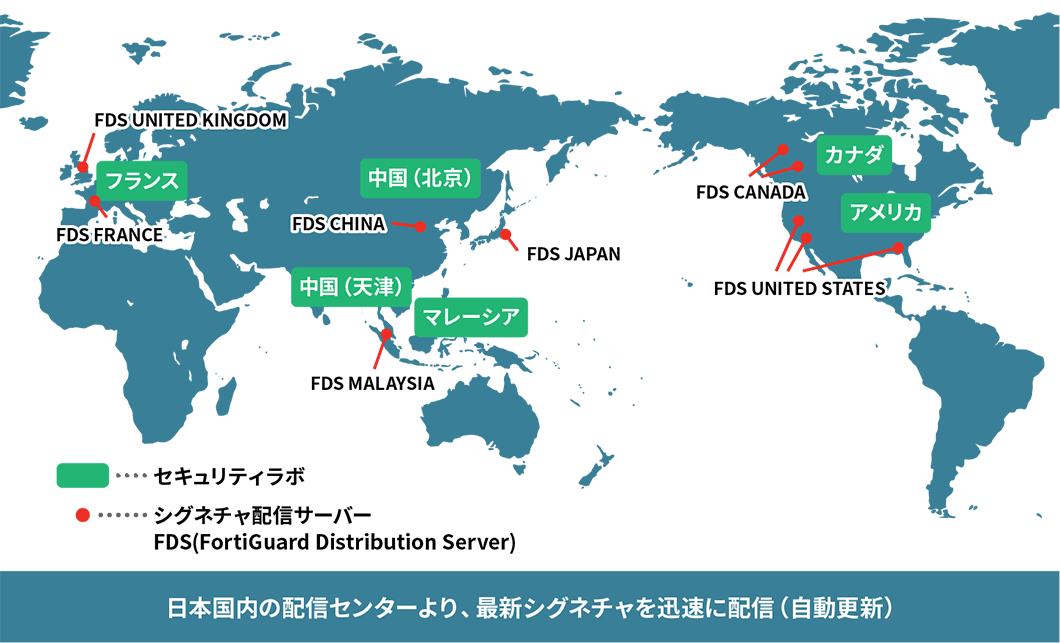 - シグネチャ配信サーバーは日本国内にも設置されており、日本国内のFortiGateには効率のよいシグネチャ配信が可能です。
