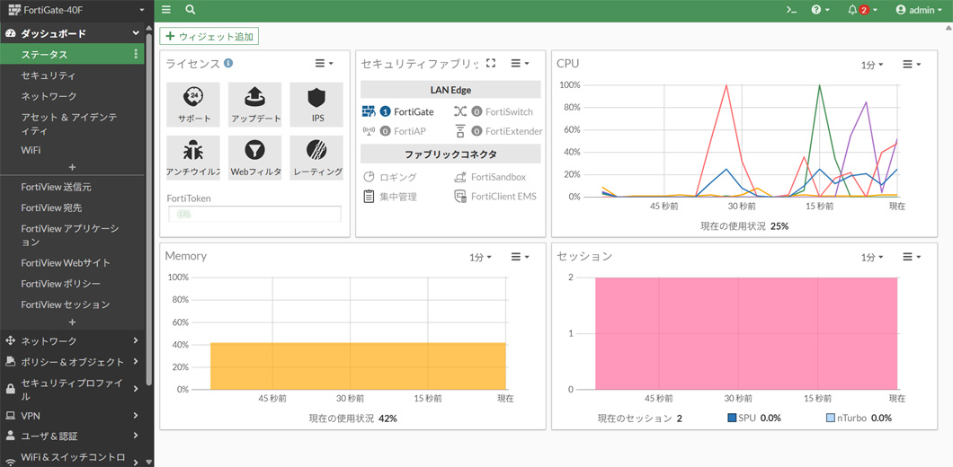 FortiGateシリーズは「使いやすさ」にもこだわって作られています。ネットワークの状態がグラフなどで視覚的に表現されており、わかりやすい日本語GUIで設定・操作が可能なため、管理が容易です。