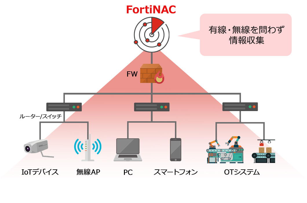 FortiNACは、有線・無線問わず、ネットワークに接続されるすべてのデバイスを自動的に検出し、可視化・管理を行うソリューションです。ITはもちろん、IoT/OT含むさまざまなデバイスを把握。未管理のデバイスや、セキュリティ対策が不十分なデバイスの接続を検出し、セキュリティを強化できます。
