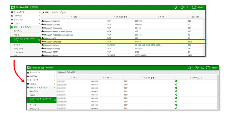ISDBとはクラウドサービスのIPアドレス、ポート番号、プロトコルの情報を持つFortinet独自のデータベースです。IPSやアンチウイルスと同様にFortiGuardから情報を取得します。