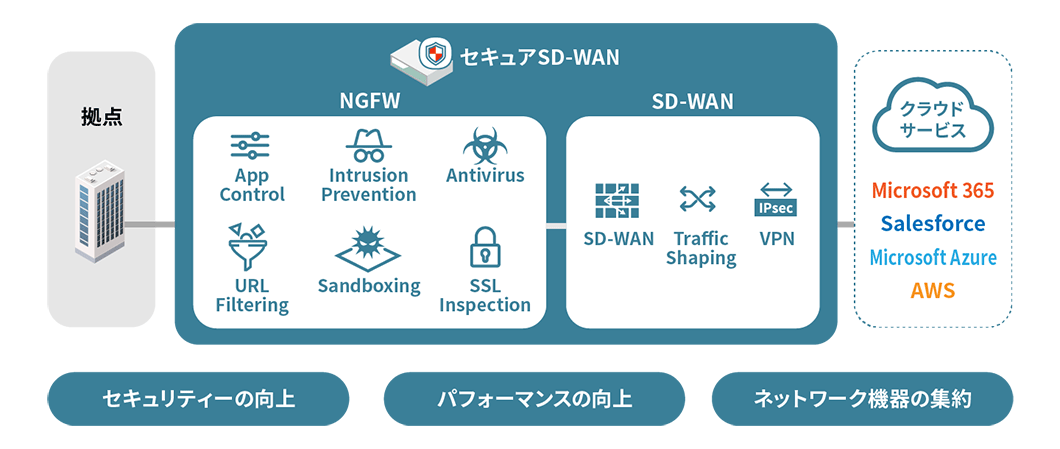 インターネットブレイクアウトを導入する場合、直接インターネットとつながる環境となるためセキュリティ対策が不可欠です。 FortiGateはUTM機能を搭載しているため、インターネットブレイクアウトで直接インターネットに接続しつつ、セキュリティの向上も期待できます。また、SPUと呼ばれる独自開発の専用プロセッサー(ASIC)によりトラフィックの高速処理を実現するため、パフォーマンスの向上も期待できます。FW/UTM/負荷分散といったさまざまな機能をFortiGate 1台に集約することができるため、複数のネットワーク機器が不要となりコストの削減にもつながります。
