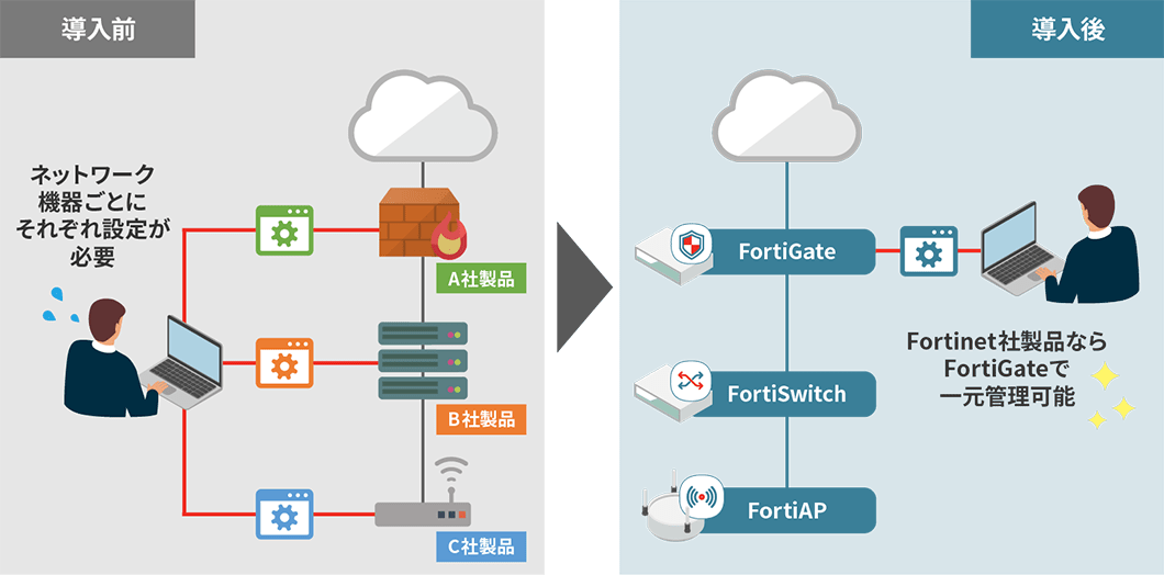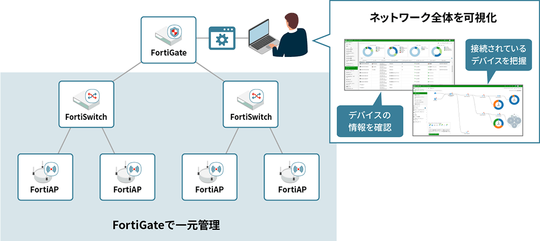 Fortinet社独自の管理プロトコルであるFortiLinkによってFortiGateをLANコントローラーとして利用することで、Fortinet製品群のひとつとして統合・一元管理が可能になります。