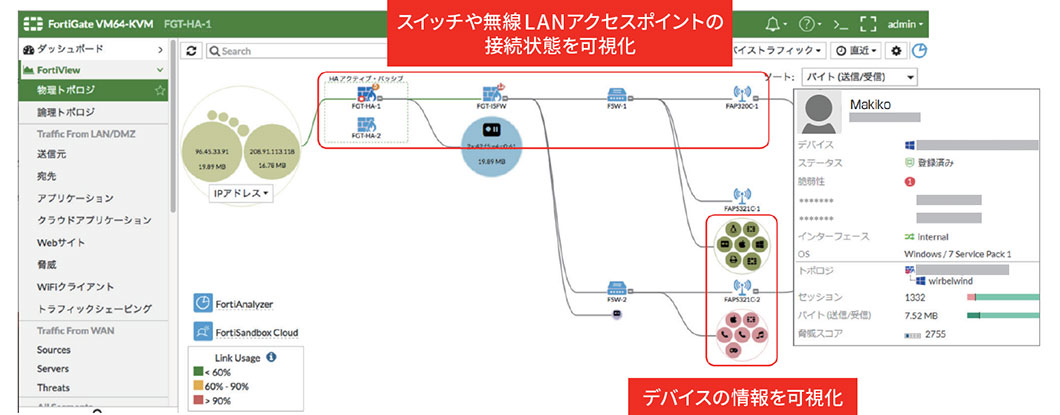 Fortinet社の提供するFortiGate/FortiSwitch/FortiAPを導入した場合、LANエッジソリューションを利用することで、FortiGateの管理画面から、スイッチ、AP、そしてそれらに接続されている端末まで、ネットワークインフラ全体をまとめて管理することが可能です。FortiGateの管理画面から、FortiGate配下のすべてのFortiSwitch/FortiAPの設定変更やログの確認できるため、ネットワーク管理にかかる時間を短縮できるほか、設定の自動同期機能があるため、管理者の負担も軽減できます。
