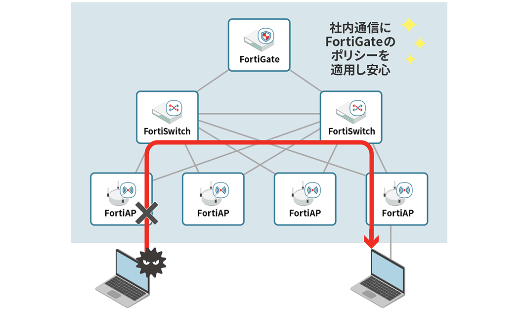 社内のVLANを跨ぐ通信および、FortiSwitchのAccess VLAN機能を用いた同VLAN内の通信にFortiGateのポリシーを適用することで、LAN環境内部のマルウェア感染に早期に対応。感染拡大防止が可能です。