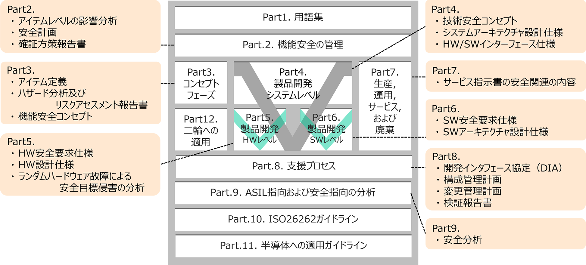ISO26262の各Partでは、要求仕様書・アーキテクチャ設計書など多岐にわたる作業成果物の作成が求められます。
