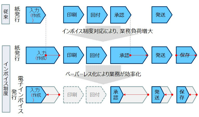 現在、消費税法上、請求書などは原則として紙で発行する必要があります。インボイス制度が施行されると、消費税法上、電子データでの発行・交付が可能となります。 そこで、電子インボイスの導入により、請求書発行業務のシステム化(既存のシステムの改修を抑えることにもつながります)や、請求書受領後の入力・照合などの自動化が期待できます。また、ペーパーレス化により、業務のスピードアップも見込まれます。